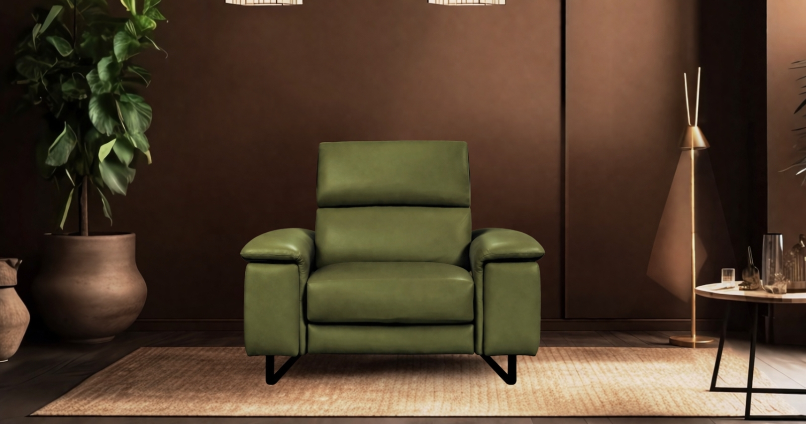 En première photo, le salons BRAGA est habillé en vachette premium vert olive.