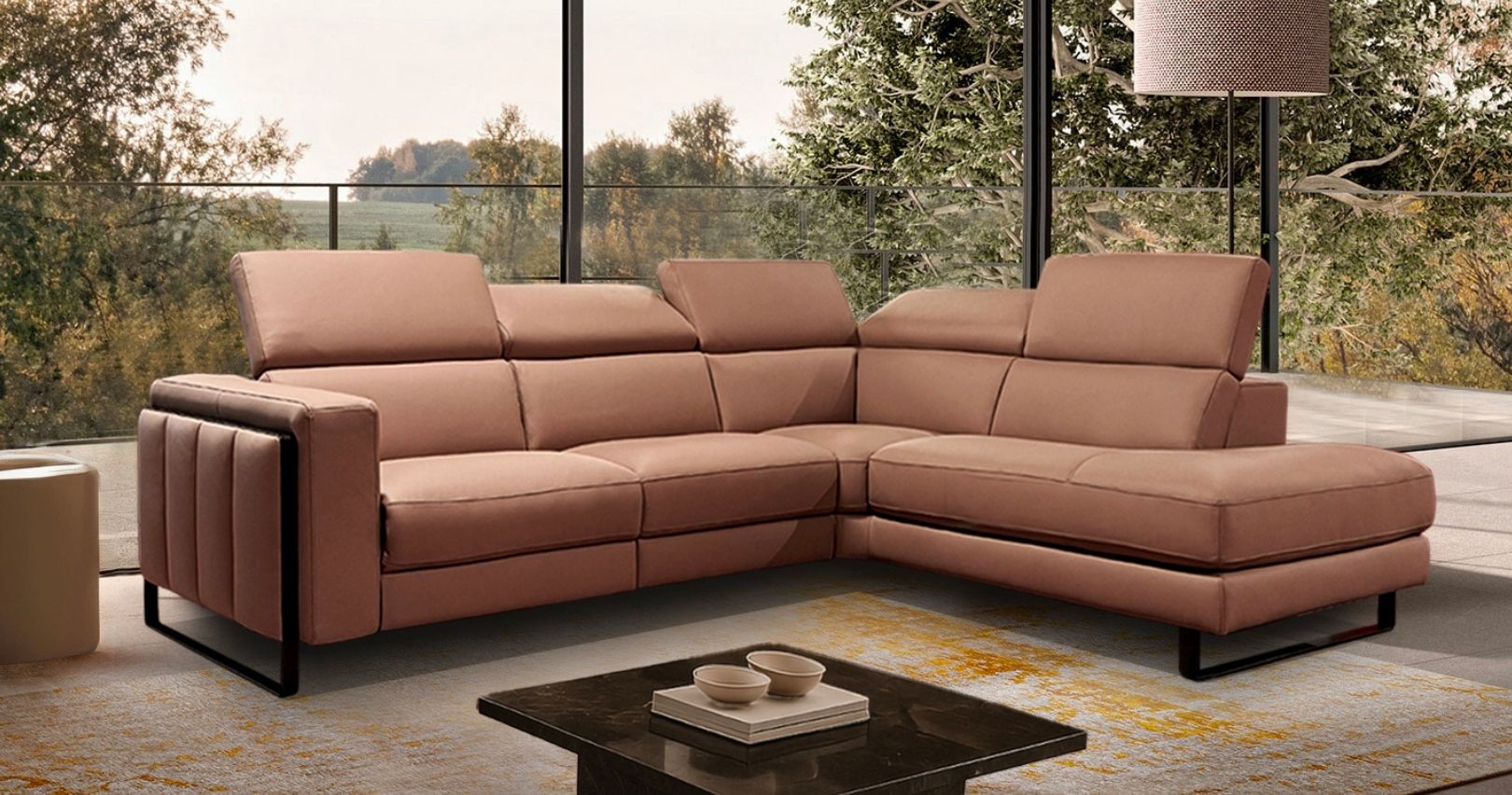 En première photo, le salons CESANO est habillé en vachette premium Vieux Rose