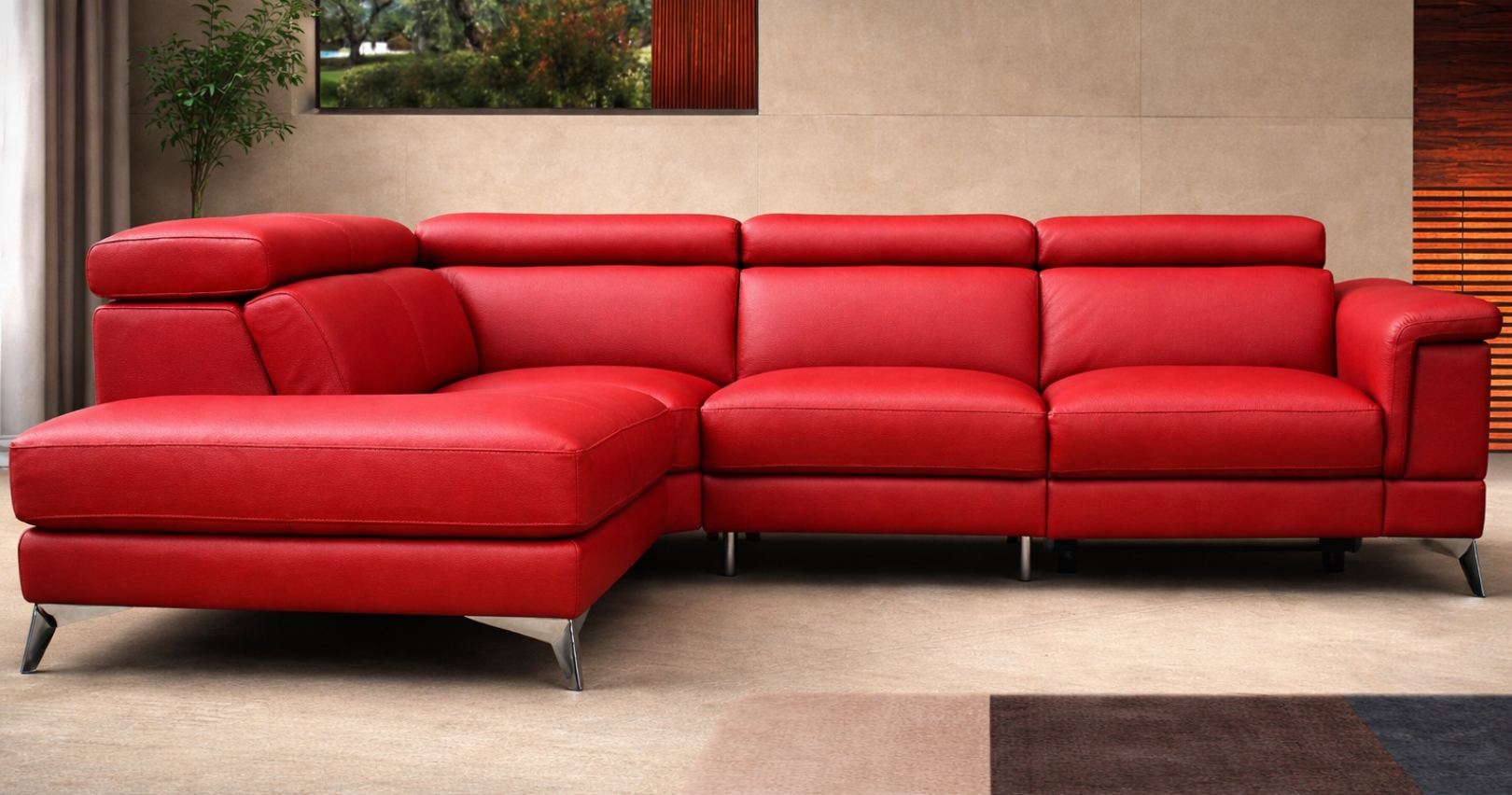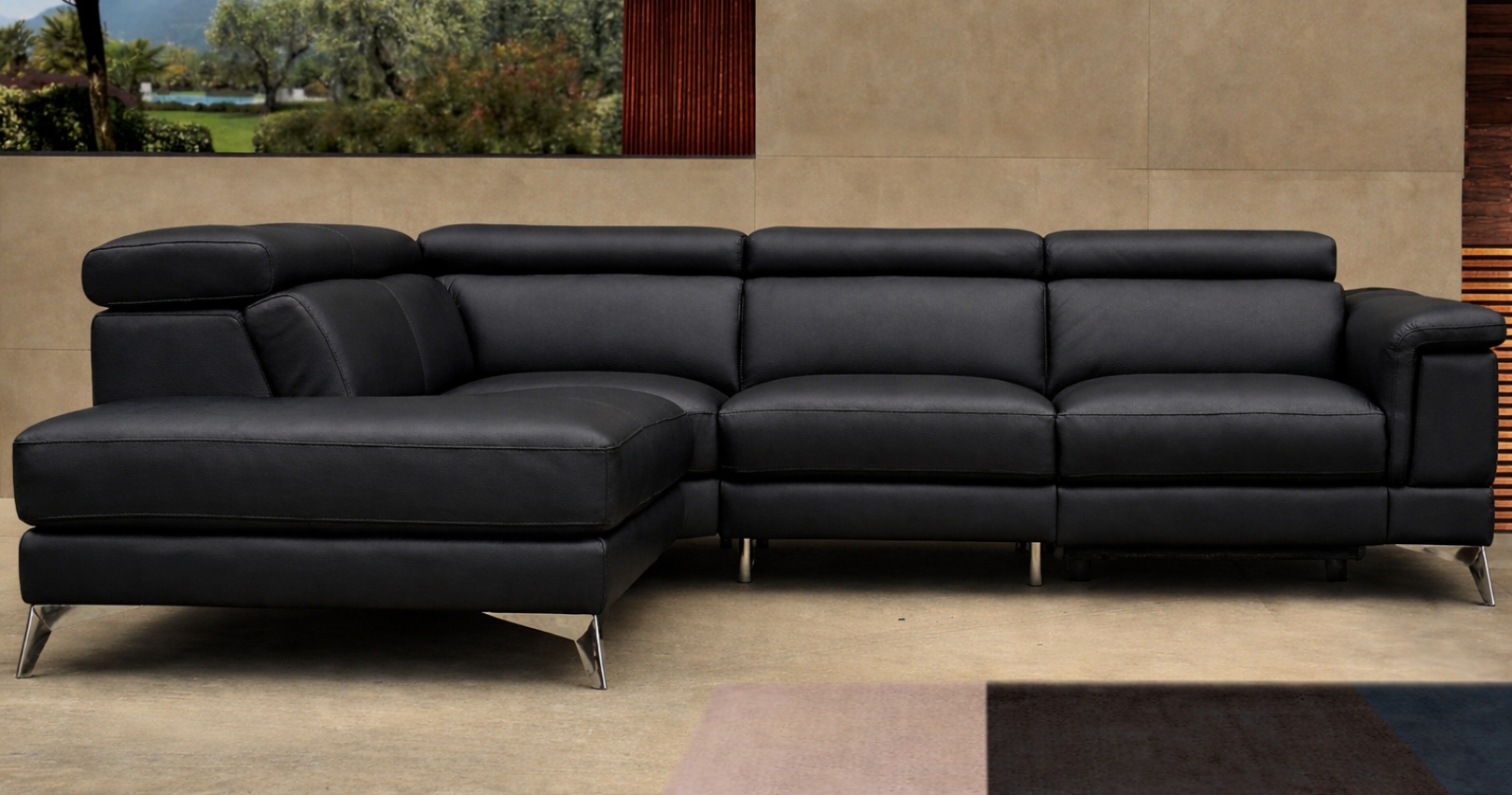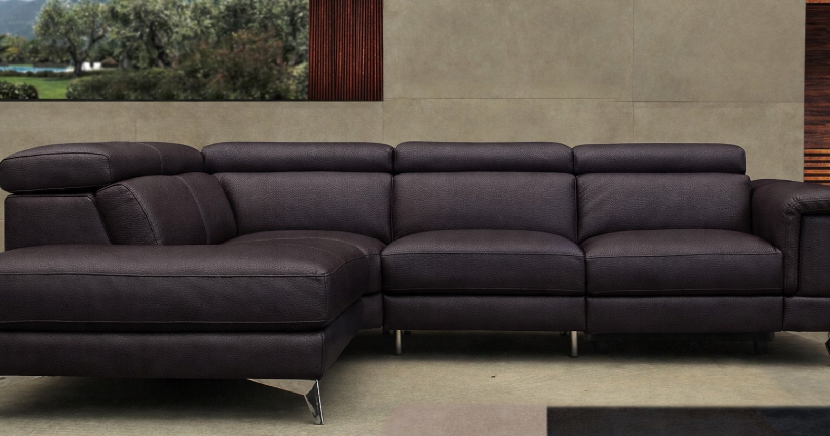 JUPITER : Angle panoramique contemporain, design avec base allégée sur pieds acier chromé. Pour un confort ajusté JUPITER dispose de 5 têtières relax relevables et réglables. Il est intégralement habillé de Cuir Vachette Premium épaisseur ou Excellium. Possibilité d'obtenir cet ensemble avec une relaxation.