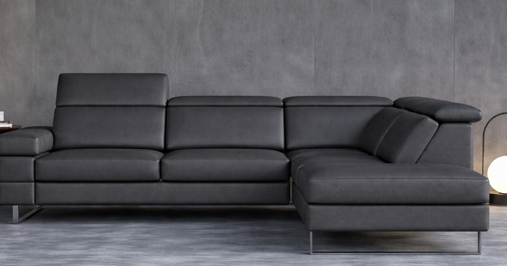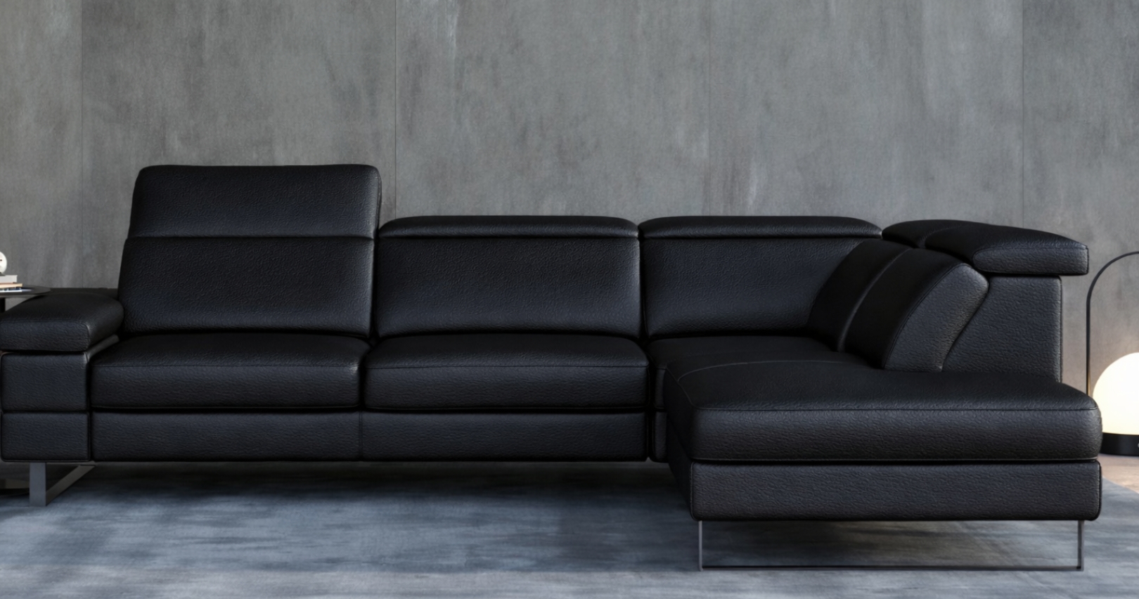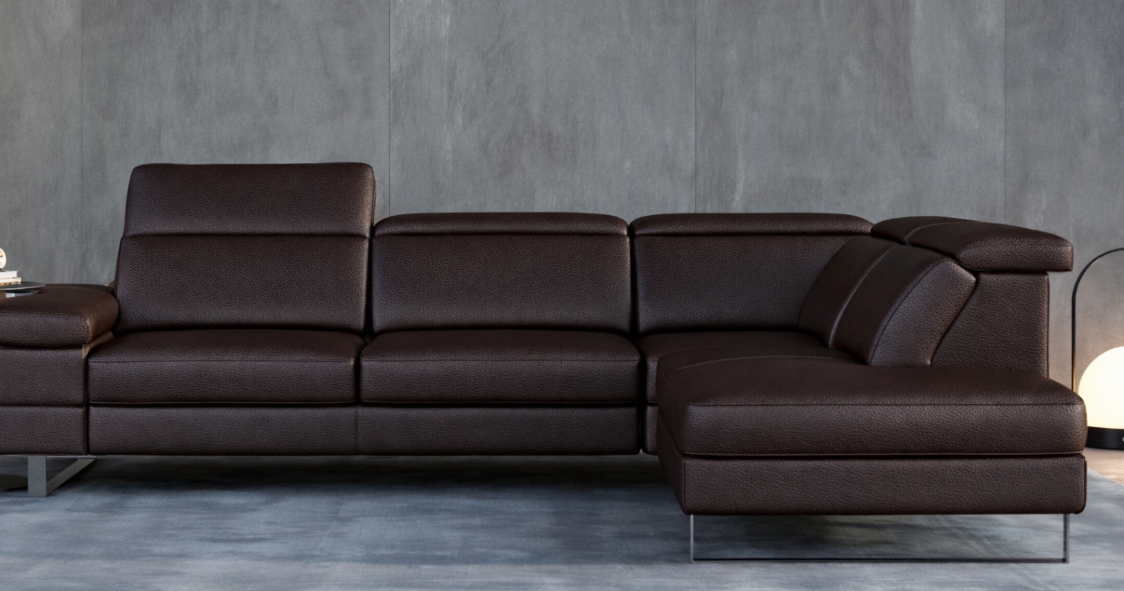 RIVAGE, canapé d'angle contemporain, avec relaxation électrique (en option) ou fixe. Moderne et élégant grâce à sa base surélevée, il est entièrement habillé de Cuir Vachette Premium épaisseur 1.6 à 1.8 mm ou cuir Vachette Excelluim 2.0 à 2.2mm. Ses têtières sont relevables et réglables manuellement pour un soutien adapté de la nuque et de la tête. Possibilité de têtière(s) électrique (en option, choix à l'étape 4), uniquement avec l'option relaxation électrique.