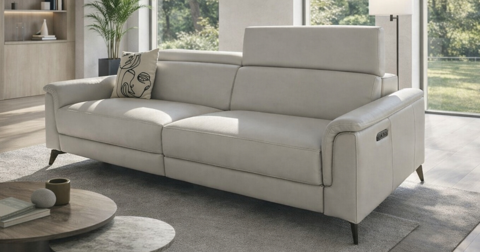 ROMANE est un canapé aux lignes contemporaines, avec système relaxation électrique ou version fixe. Ses têtières réglables et ajustables manuellement offrent un maintien adapté de la nuque et de la tête. Possibilité de têtière(s) électrique (en option, choix à l'étape 4), uniquement pour les canapés/fauteuils avec relaxation électrique. Il est entièrement habillé de cuir épais Vachette Premium ou Vachette Excellium et son utilisation est simple et sans effort grace à ses boutons de commande tactile. Ses pieds design viennent parfaire ce modèle et lui donne une allure unique (choix de la couleur des pieds à l'étape 4).